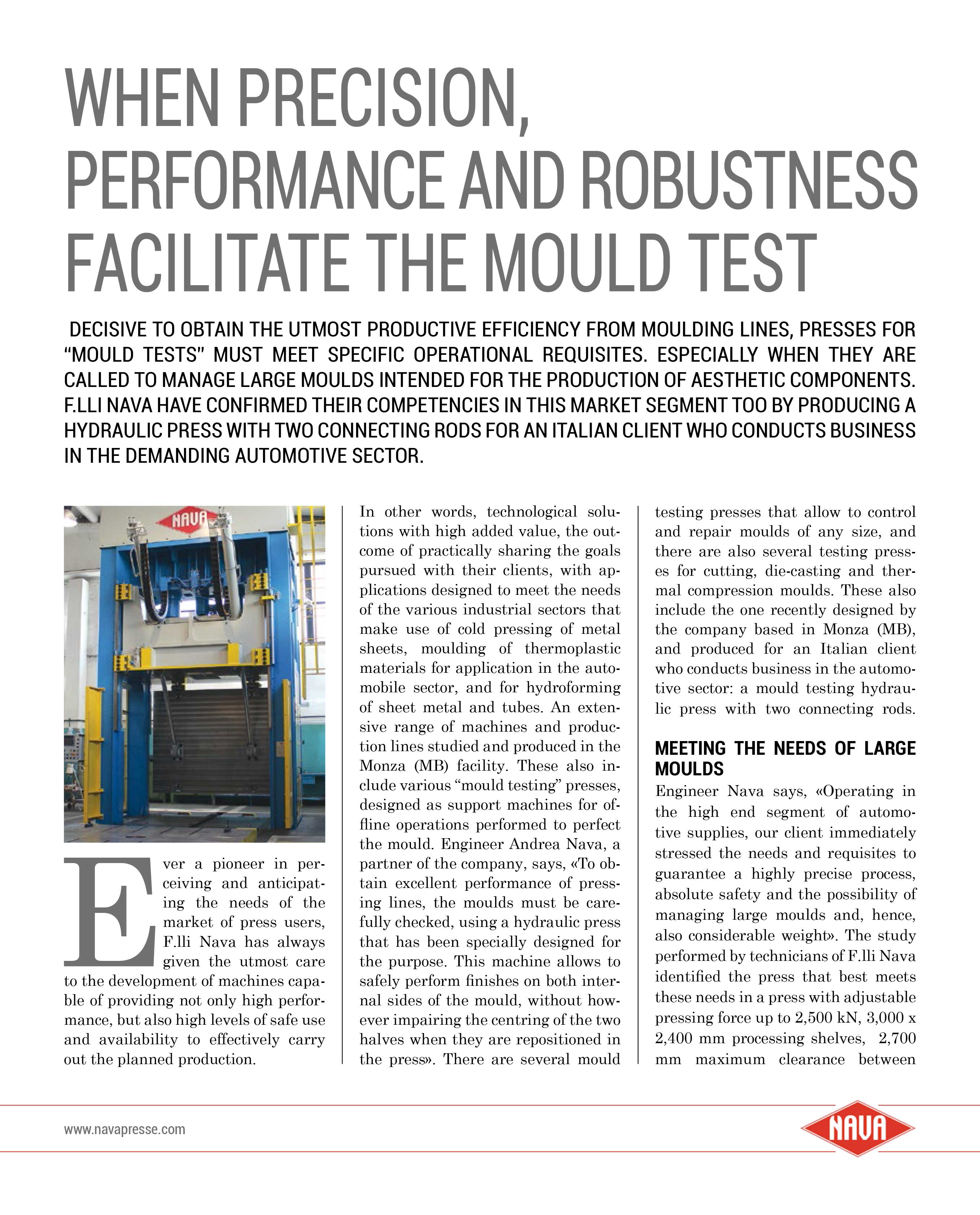 “Our client immediately stressed the needs and requisites to guarantee a highly precise process and total safety, the possibility of managing large moulds and, hence, also considerable weight”. The study performed by F.lli Nava technicians identified the press that best meets these needs in a press with adjustable pressing force up to 2,500 kN, 3,000 x 2,400 mm working plates, 2,700 mm maximum clearance between them, 3,010 mm clearance between the frontal connecting rods, and up to 30+30 tons capacity to manage moulds between the bottom and top part.