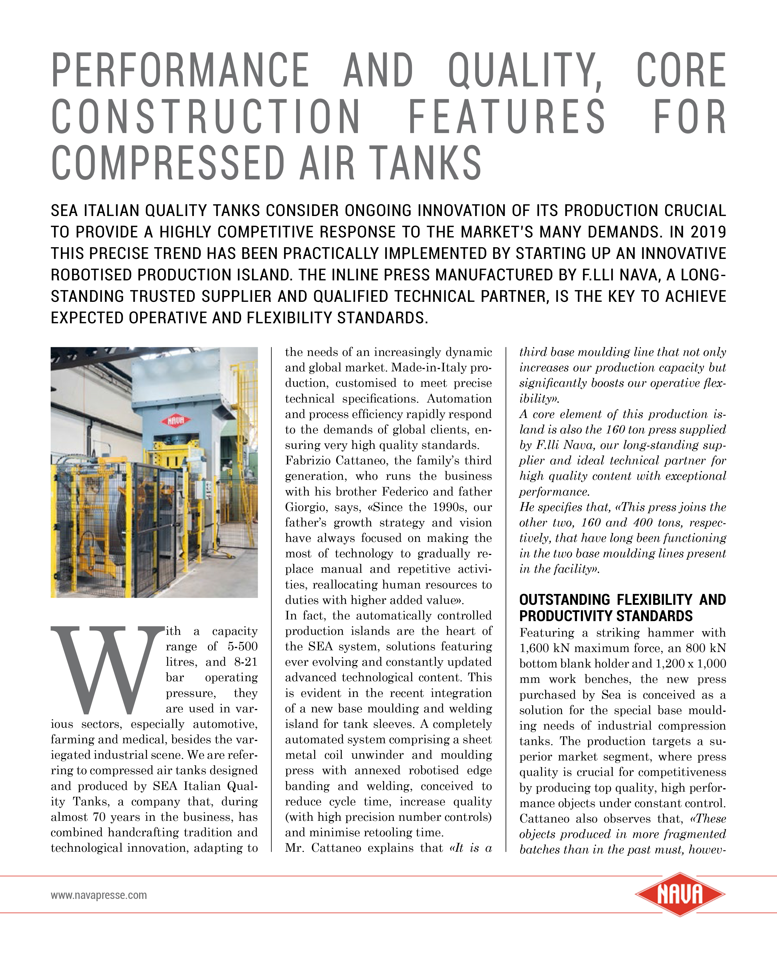 SEA Italian Quality Tanks consider ongoing innovation of its production crucial to provide a highly competitive response to the market’s many demands. A precise trend that this year took shape with the start-up of a new robotic production station. The inline press manufactured by F.lli NAVA, a longstanding trusted supplier and qualified technical partner, is the key to achieve expected operative and flexibility standards.